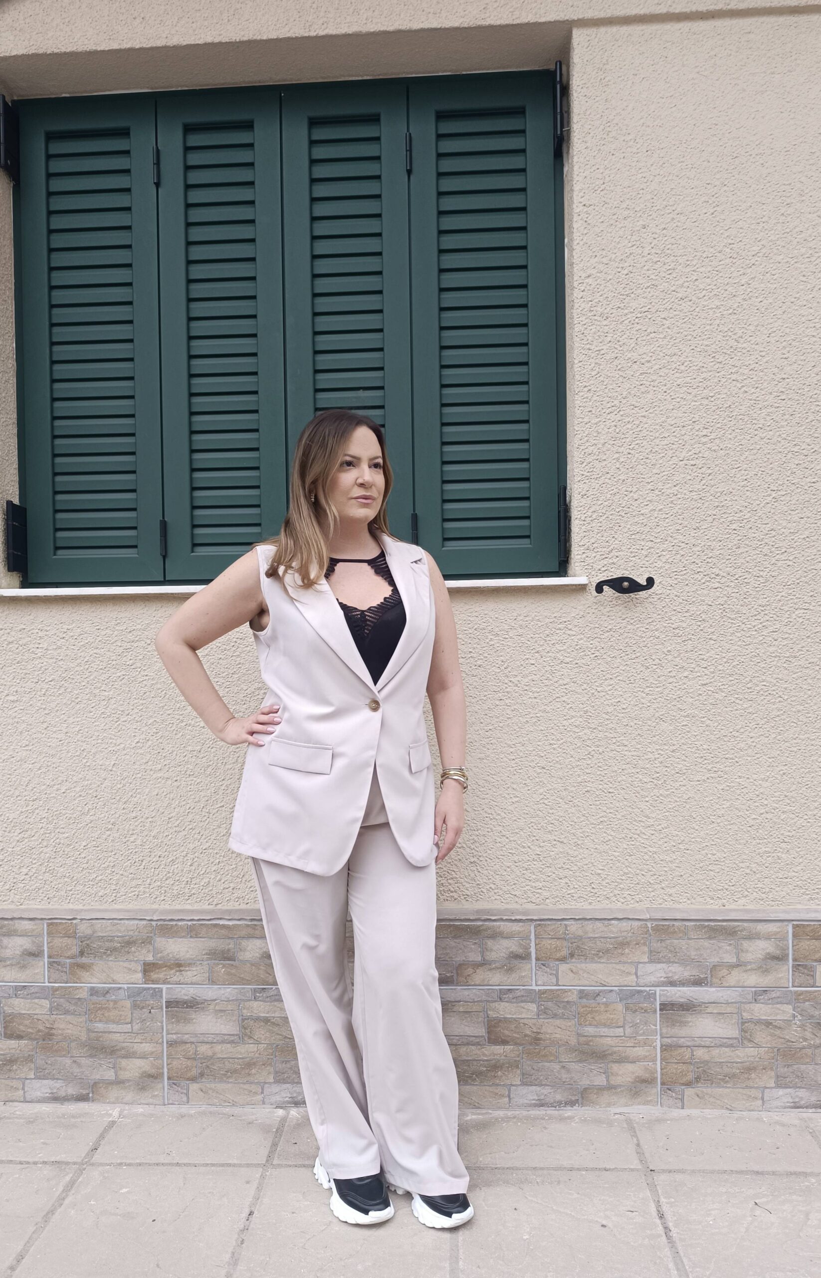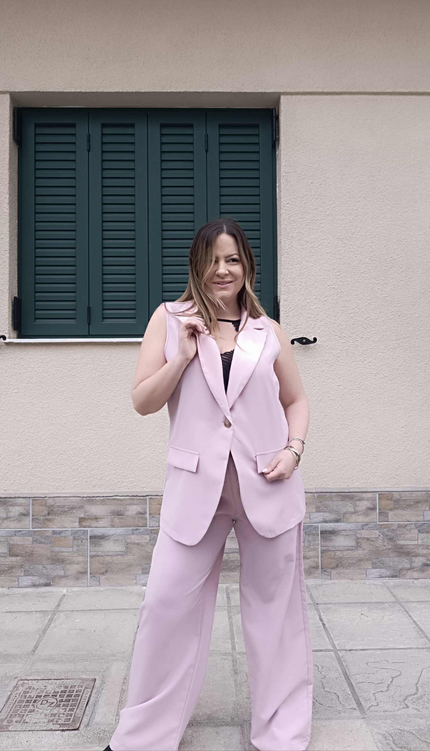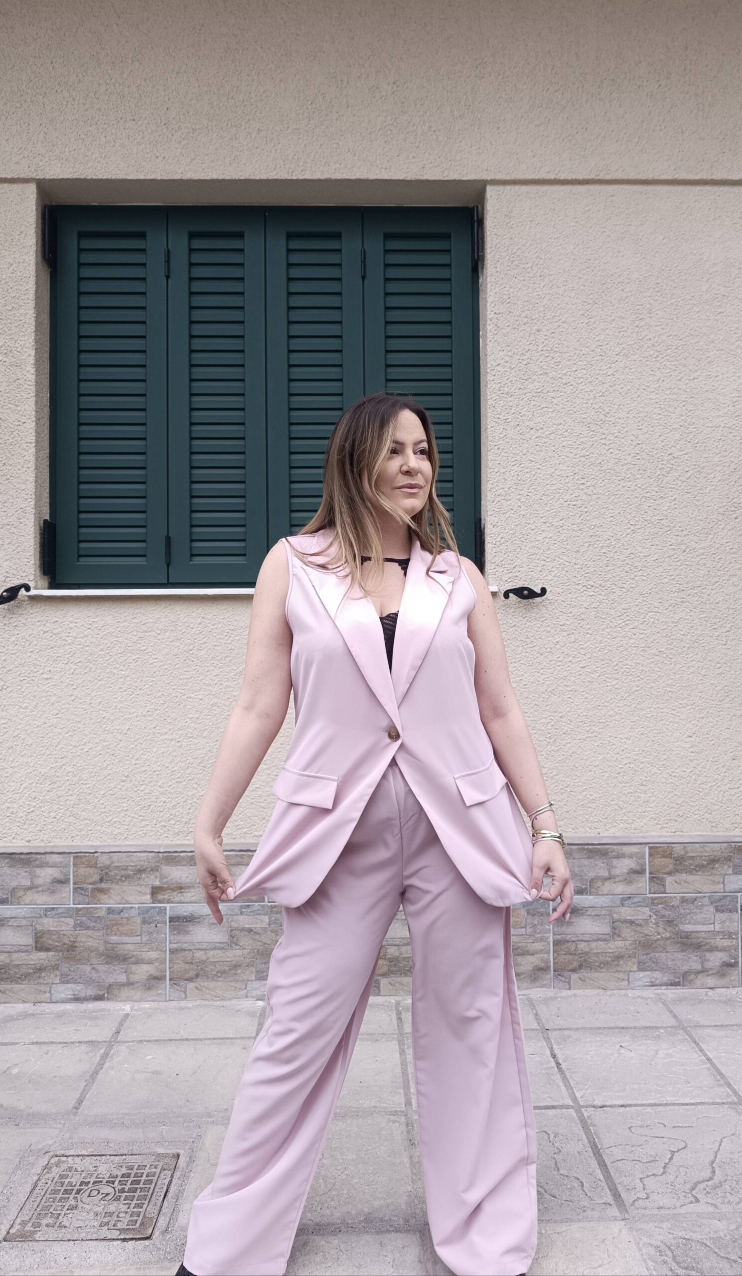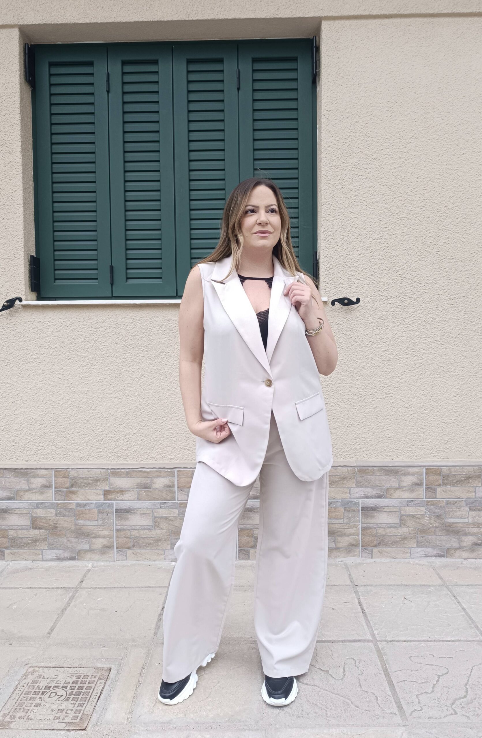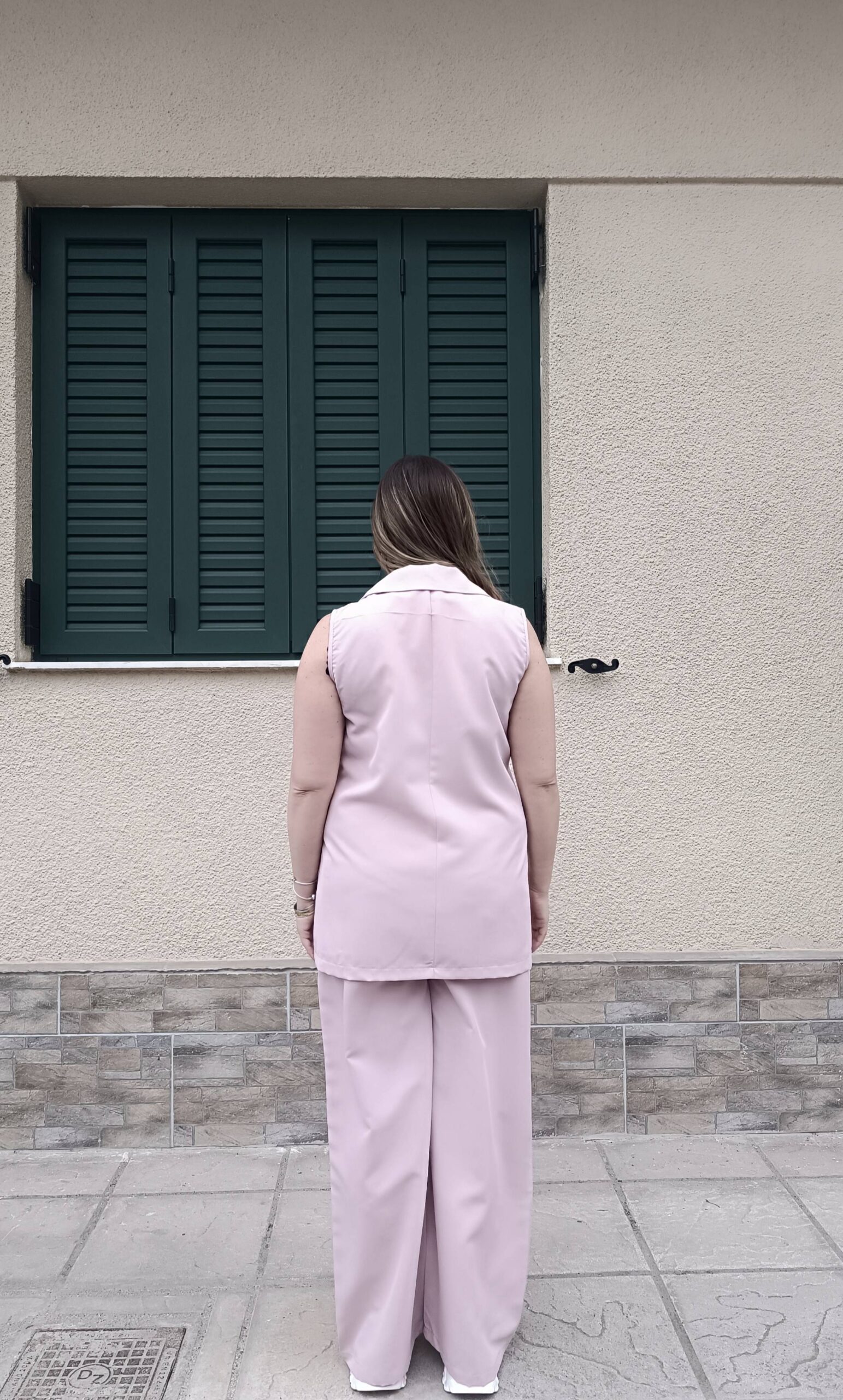 ✅ Υπέροχο σετ με μακρύ γιλέκο, το οποίο κλείνει με κουμπί μπροστά.