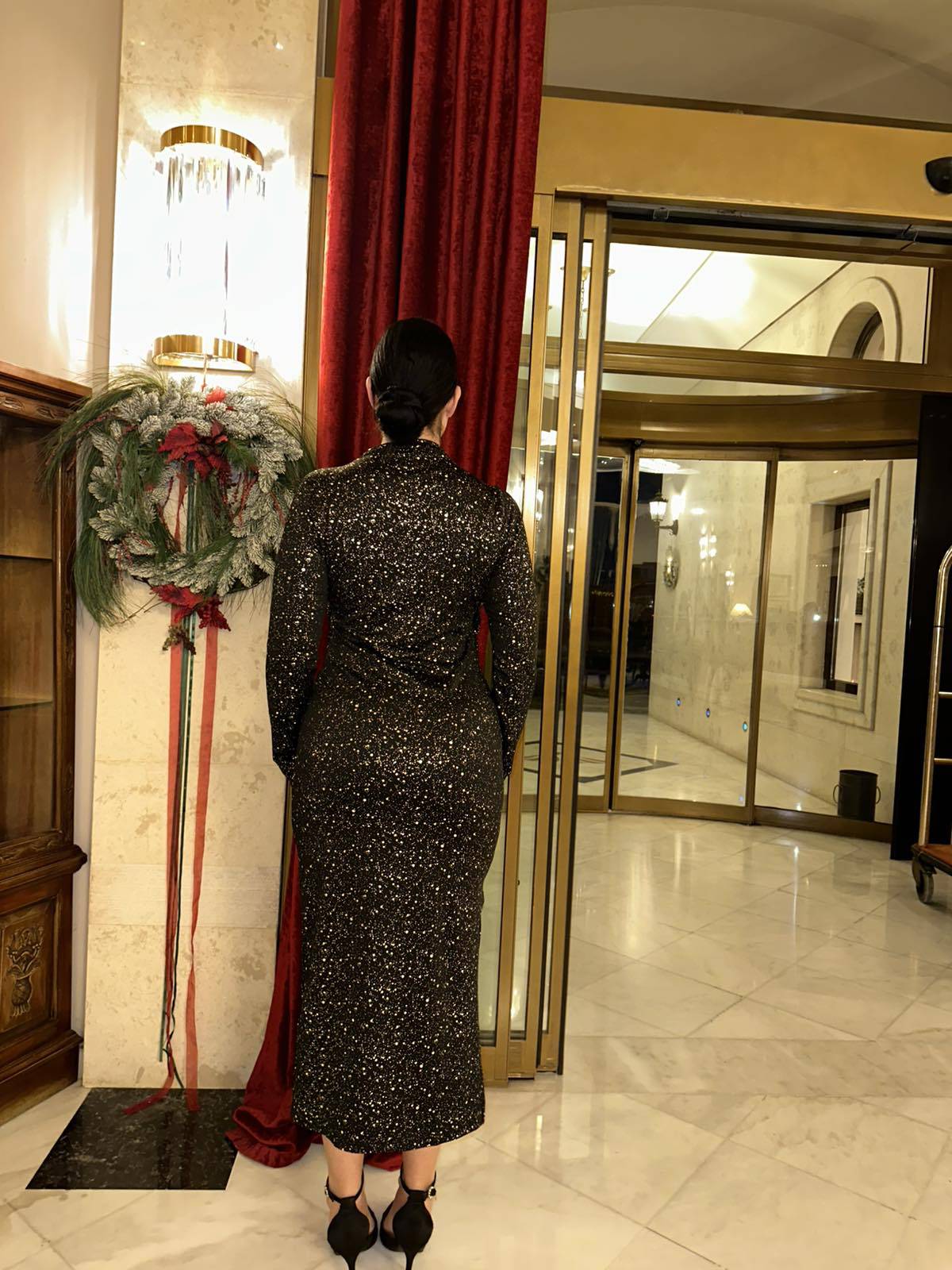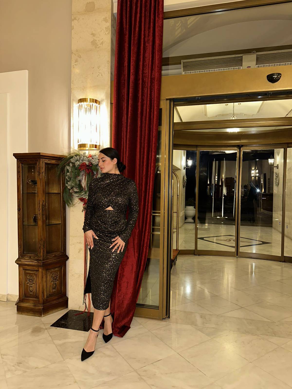 ✅Μαύρο μίντι φόρεμα με λάμψη σε όλη την επιφάνειά του .✅Διαθέτει κλειστό λαιμό και ιδιαίτερο άνοιγμα κάτω από το στήθος .✅Διαθέτει μικρό σκίσιμο . ✅Η εφαρμογή του είναι απλά άψογη . ✅Διαθέτει ελαστικότητα καθώς είναι φτιαγμένο από ελαστίνη, βαμβάκι και πολυέστερ. ✅One size καλύπτει στήθος έως 120 και γοφούς έως 118 με 120 τεντωμένο.