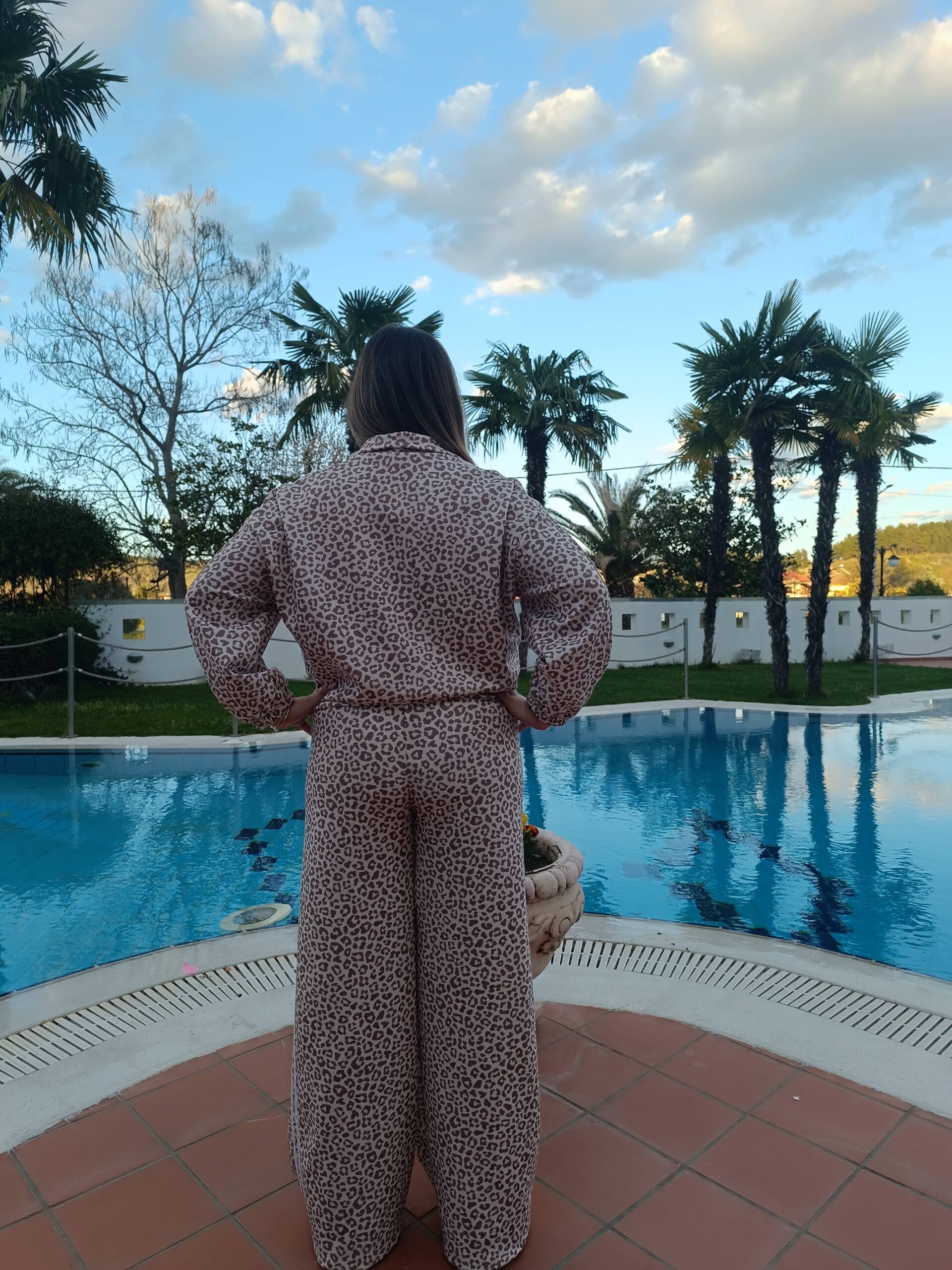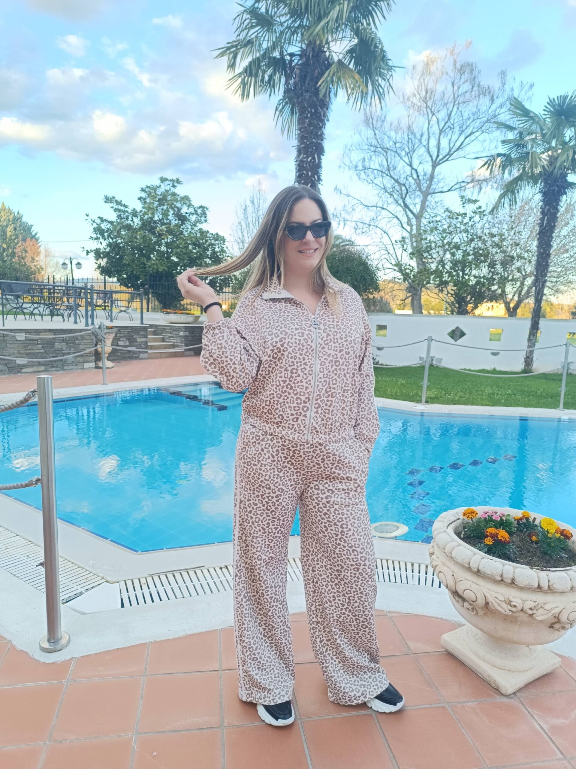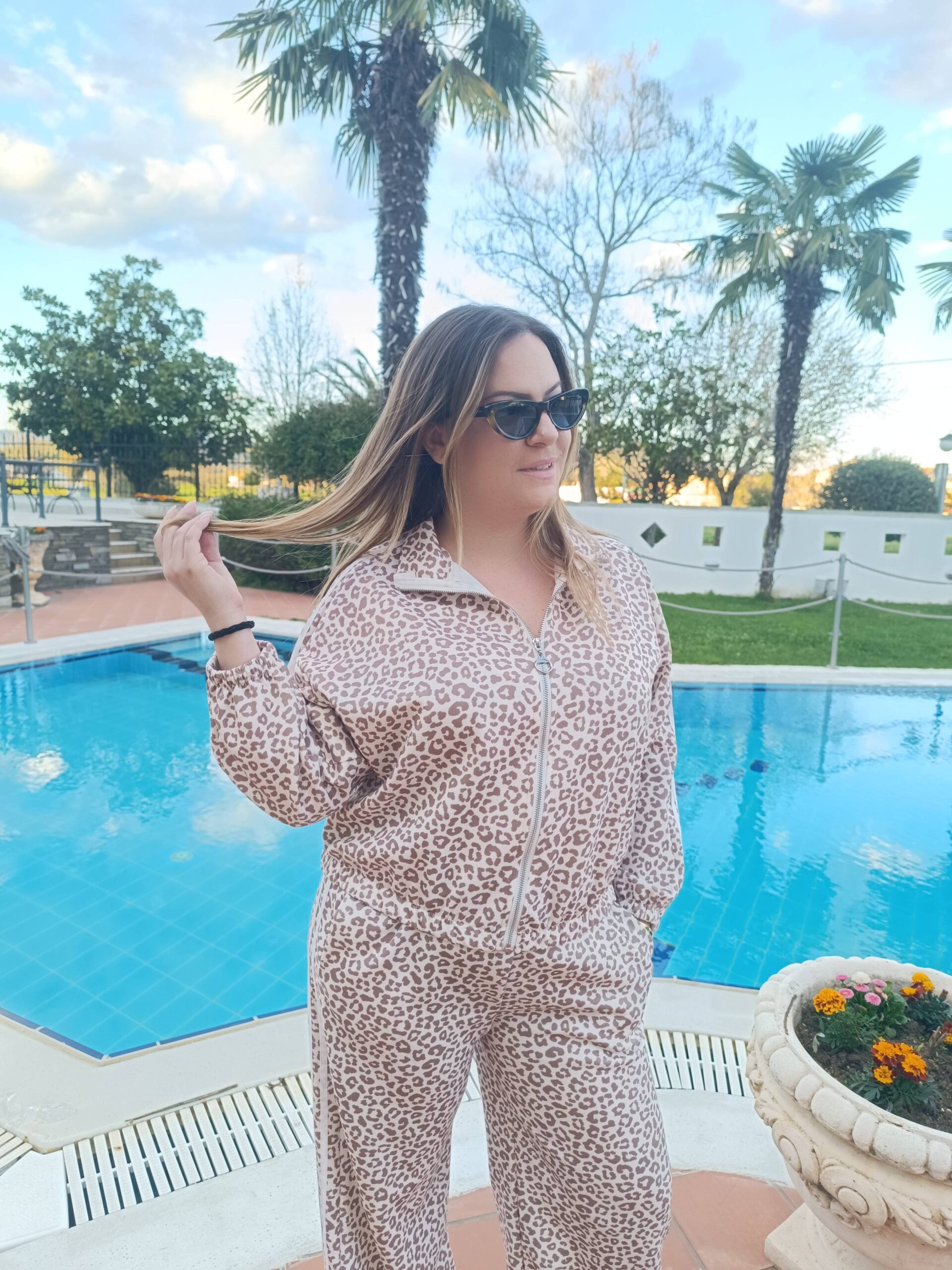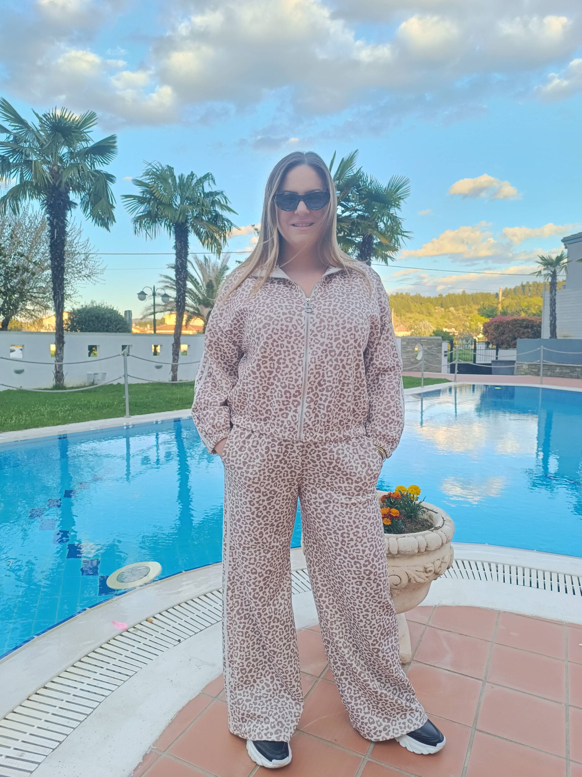 ✅ Το σύνολο αποτελείται από ζακέτα με φερμουάρ και παντελόνι σε χαλαρή γραμμή, διακοσμημένο με διακριτικό animal print σε γήινες αποχρώσεις.